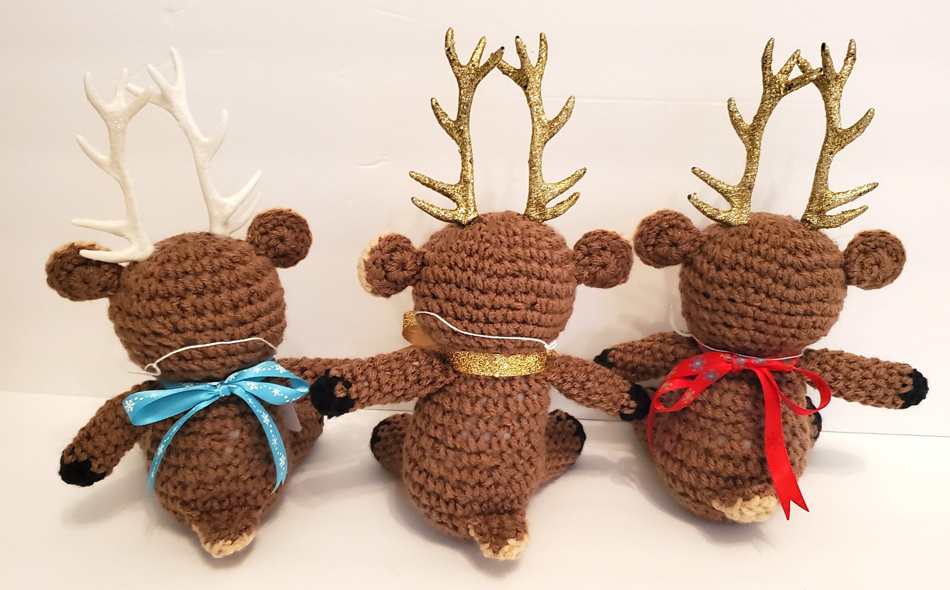 Each has two safety eyes, a safety nose, made with worsted weight yarn, and added miscellaneous décor to make each of them unique. These reindeer have plastic horns that are decorated with glitter, they are glued into the head with Gorilla Glue. I recommend these for decorative purposes only mainly due to the horns. :)